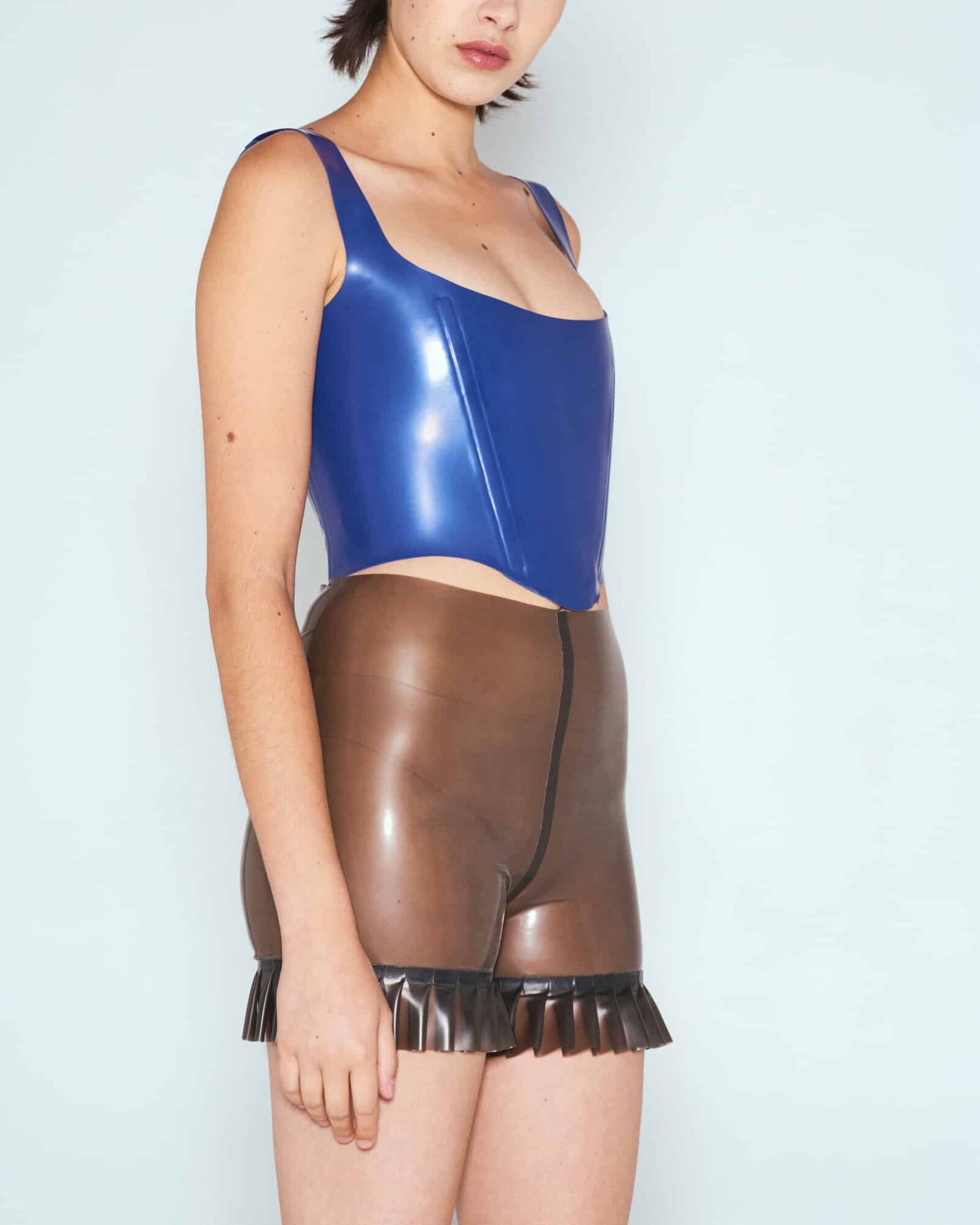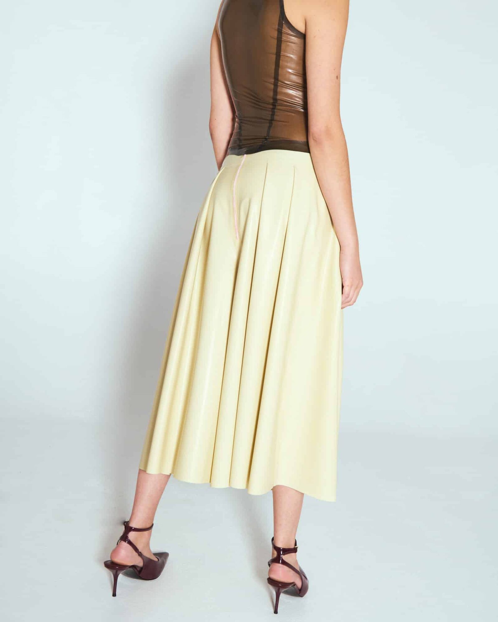 Culotte skirt designed with four structured pleats at the front and back to enhance volume and movement. Made from premium 0.4 mm latex for a sleek, flawless drape and a sculpted silhouette. Features a concealed back zipper for easy wear.